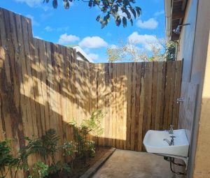 • For a unique coastal experience, enjoy the private outdoor bathroom behind an avocado tree — a hot shower under the sky with a basin tucked beneath the open air.